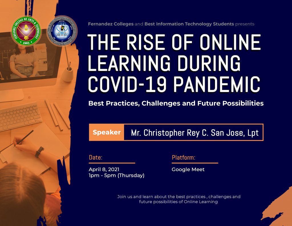 The current pandemic didn’t stop the Best Information Technology Students (BITS) headed by Paolo G. Duya, BITS President as they conducted a webinar last April 10, 2021 via Google meet with the theme “The Rise of Online Learning During Covid-19 Pandemic: Best Practices, Challenges and Future Possibilities” which was discussed by the guest speaker, Christopher Rey San Jose, LPT. The event was attended by the students and Professors of the Computer Studies Department.