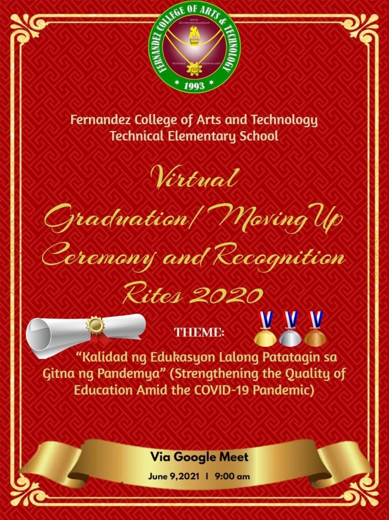The Elementary and Junior High School (JHS) Departments of Fernandez College of Arts and Technology (FCAT) held their respective end of school year rites through Google Meet and streamed on YouTube and Facebook Live. The theme for the two events was “Strengthening the Quality of Education Amid the COVID-19 Pandemic”. The events included the Graduation of the Grade 6 students, moving up of the Kindergarten and Grade 10, as well as the recognition rites for all students.